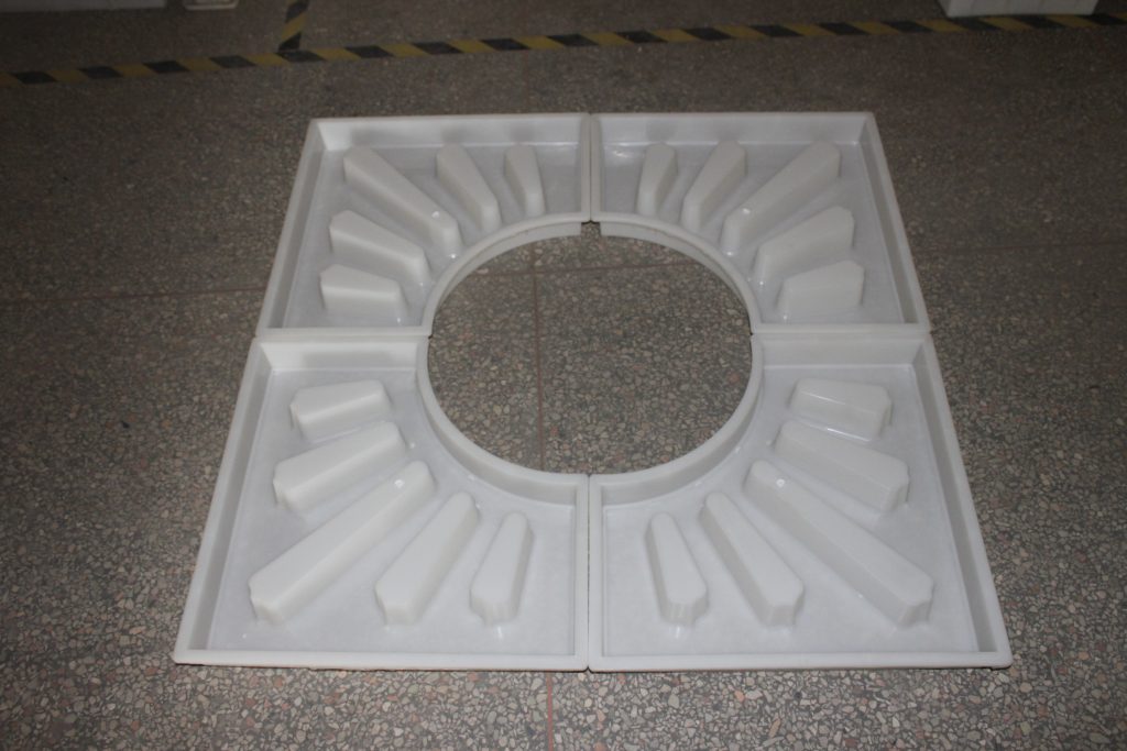 太陽型水泥樹圍模具主要采用了PP聚丙烯塑料為原料,經(jīng)注塑加工完成。主體結構由四塊拼接組成,由于塑料模具表面由類似陽光一樣的線條設計,遂得名太陽型樹圍模具。不要小看這一條條的線條設計,除了在美觀結構上有所表現(xiàn),最為關鍵的是在實際成品的空隙之處方便綠草生長,增強土壤結構,對于樹木的保護更為有力。