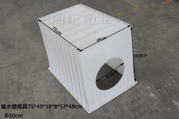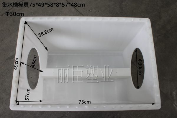 此款產(chǎn)品為客戶定制水泥集水槽模具,使用全新聚丙烯塑料原料,其中集水槽模具長(zhǎng)度為75厘米,寬度為49厘米,深度積水區(qū)高度為57厘米,稍淺積水區(qū)為58.8厘米,實(shí)際高度深淺主要取決于預(yù)制水泥集水槽成品,具體詳細(xì)尺寸可參考下圖: