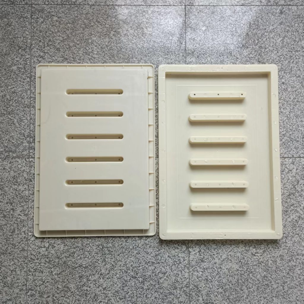 這款塑料雨水蓖模具厚度只有3cm,長寬尺寸為60cm*40cm,他主要用于下水、流水蓋板活性混凝土預制(RPC)預制,他的厚度較薄,與一般材質的雨水蓋模具不同,他采用的材質是ABS材質,這種材質質地比PP材質硬,強度大,使用次數多,這種模具主要預制成型雨水蓋板,普通用于市政道路路面排水使用。他一共有六個排水孔,排水效果很好。水流效果比較好