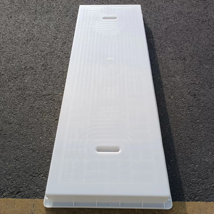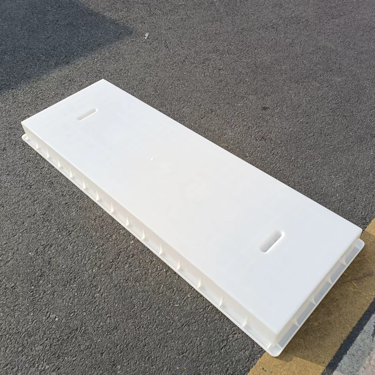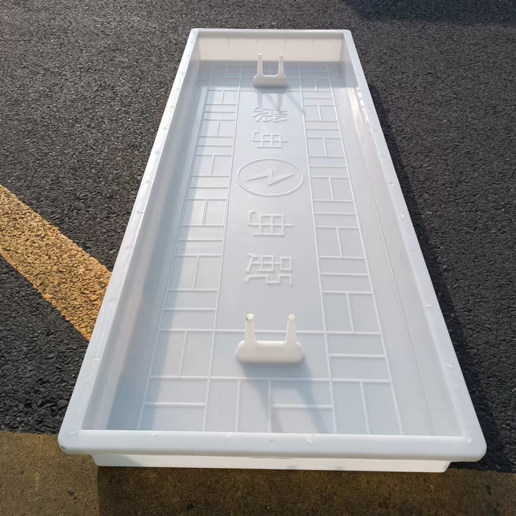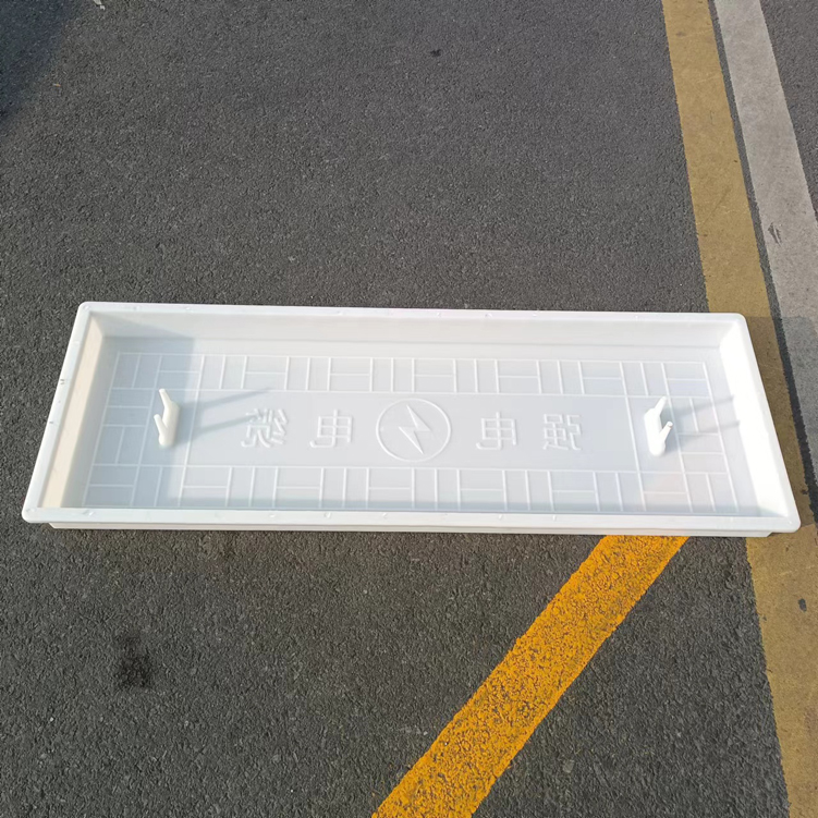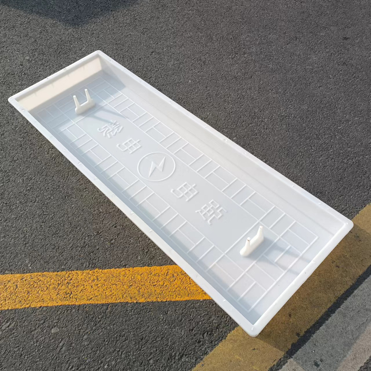 這款蓋板整體采用米白色pp材質制成、也可以使用ABS材質制成都可,模具有戴預埋件和不帶預埋件兩種,且做ABS材質的模具標準尺寸為150cm*50cm*10cm,ABS材質模具質量比做PP材質模具好一些,做PP材質模具尺寸會縮小一些,主要由于材料的性質不同,會縮小尺寸為千分之九。蓋板中間有戴電力標志,兩側帶字,帶有“電力電纜”四字。