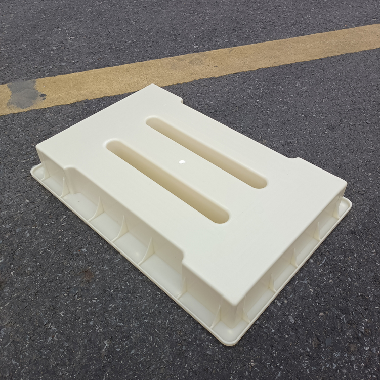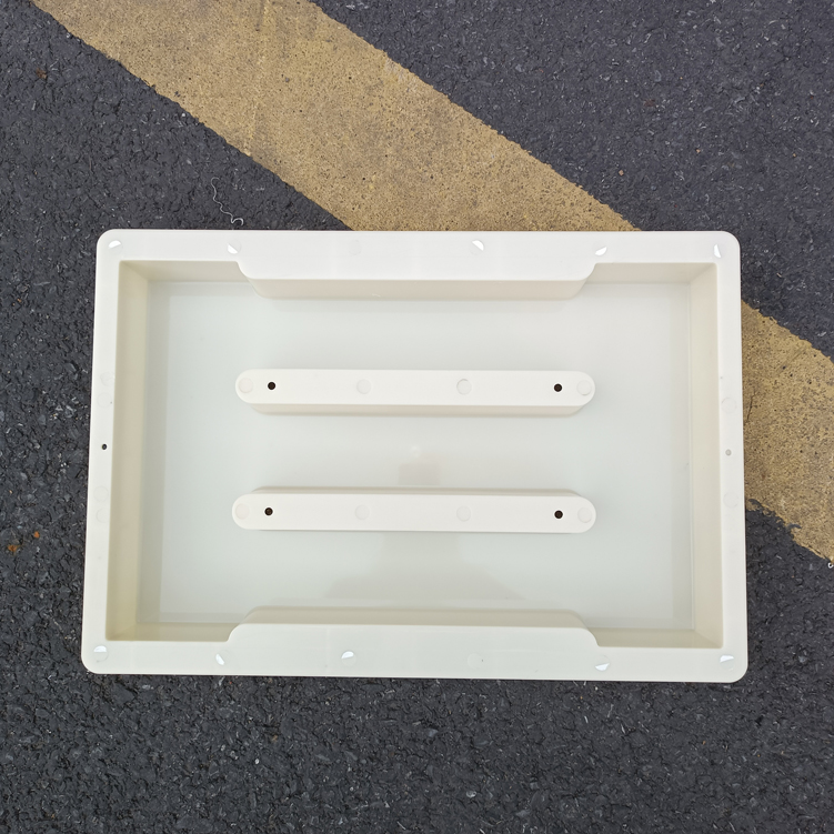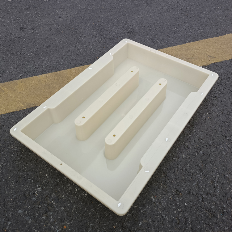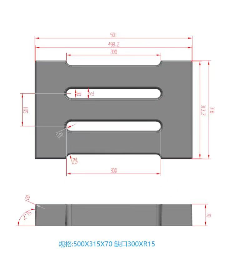 模具整體材質(zhì)采用強(qiáng)度較高的淺黃色ABS材質(zhì)制成、模具帶缺口二孔,大體尺寸為50cm*31.5cm*7cm,具體尺寸如下設(shè)計圖,模具材質(zhì)強(qiáng)度高,可以重復(fù)使用多次,擁有缺口的設(shè)計可以使雨水流通量更大,更不容易造成堵塞。